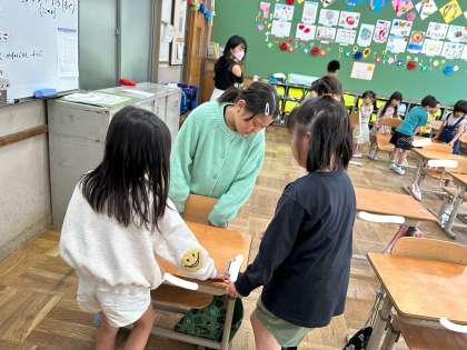 1年生も自分達でグループに分かれて掃除を始めました。6年生もお手伝いに来てくれて、一緒に集中してがんばることができました。みんなで協力して教室がきれいになって、子ども達はとても嬉しそうでした。明日からもみんなでがんばりましょう!