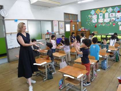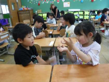 2回目の英語活動は、友達とあいさつや自己紹介をしました。「What's your nname?」「My name is ○○.」のやりとりを練習し、何度も繰り返すうちに、子ども達たちも自信をもって伝えられるようになっていました。