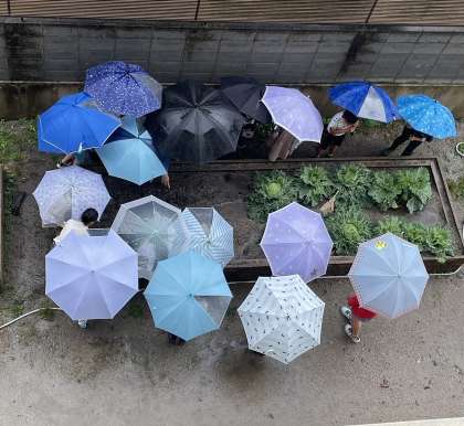 上から見ていると、傘のアジサイが咲いているようです。