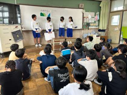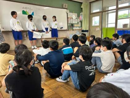 チャレンジ体験で来ている中学生に中学校のいろいろなことについて教えてもらいました。