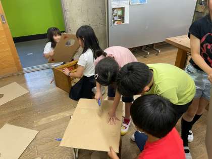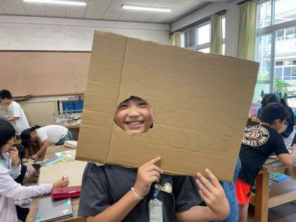下書きをして顔出し穴をあける作業では、さすが3年生!段ボールカッターの使い方もとても上手でした。さっそく顔をはめてお互いに見せ合う様子がとてもかわいらしかったです。