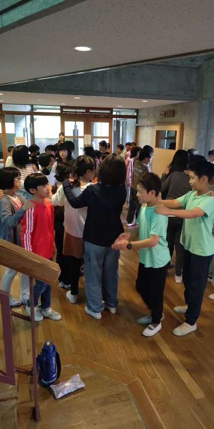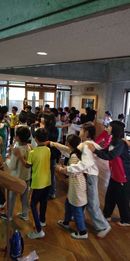 健康観察のあとレクリエーションでじゃんけん列車をしています。
