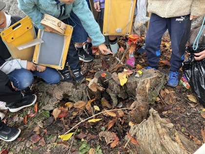 落ち葉や葉っぱ、小枝や石、草花などを使って、みんなの「すみか」を作りました。