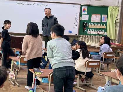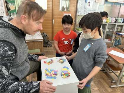 この日は、今まで英語で学習した形・色・数の言い方、英語でやり取りするときの言い方を使って、アンディー先生のところに行って、ほしい形を注文しています。