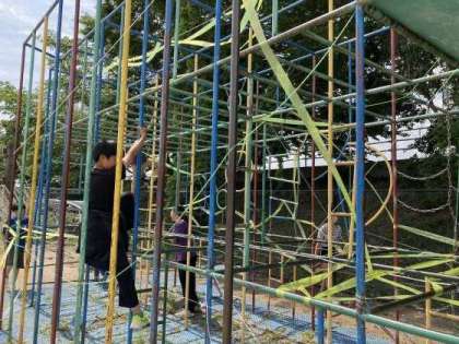 総合遊具、鉄棒、階段、など様々な場所を広く使い、糸を張り巡らせました。