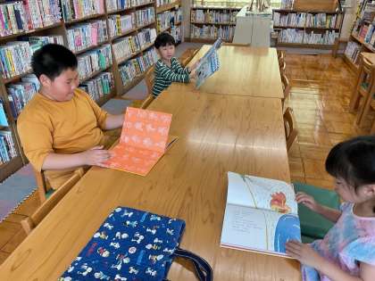 図書室で本を読むのがつくし学級。読むのも本を読んでもらうのも大好きです。怖い話、動物の図鑑、電車の本など好きな本をさがしたり、友達が読んでいる本をみんなで見たり、大きい本を開いてみたり…それぞれお気に入りを見つけて楽しんでいます!