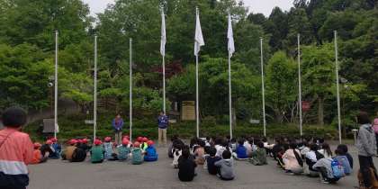 朝の集いがはじまりました。他の学校と一緒に集まっています。