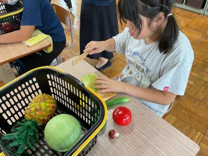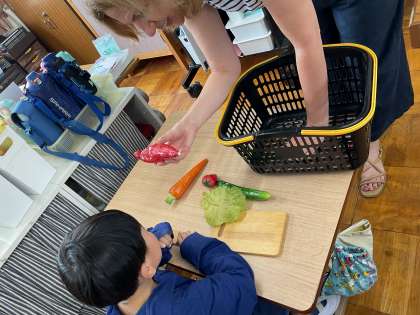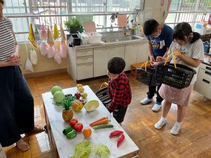 外国語の時間にお買い物ごっこをしました。野菜や果物を買うのに英語でやりとりします。たくさんお買い物をした後は,買った野菜でお料理♪「何を買ったの〜?」「これは何?」と質問されても落ち着いてこたえていました。