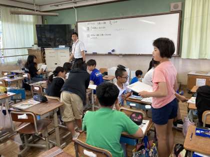 算数は、分数×分数に取り組みました。難しい内容もグループ学習で取り組んでいました。