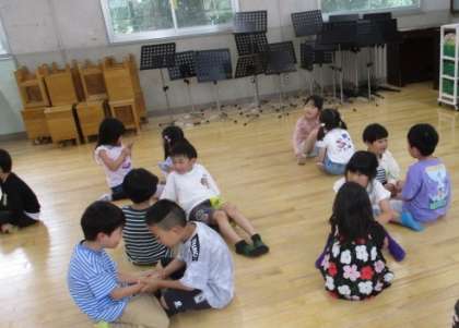 1年生の音楽では「はく」に合わせて 手拍子をうったり 歩いたりします。この日は「さんぽ」という曲に合わせて歩き、近くにいたおともだちと二人組になって握手をしたり自己紹介したりしていました。子どもたちは曲をよく聞いてはくに合わせて歩くことができました。
