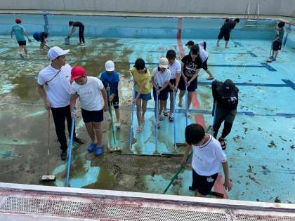最初は泥だらけだったプールも作業が終わるころには、すみずみまできれいになりました。