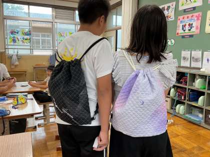 6年生が明日から修学旅行に出発です。家庭科の授業でナップサックを作りました。好きな布地を選んでミシ ンで縫ってひもを通して完成です!!これを背負って楽しんできてね♪