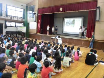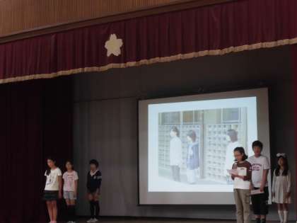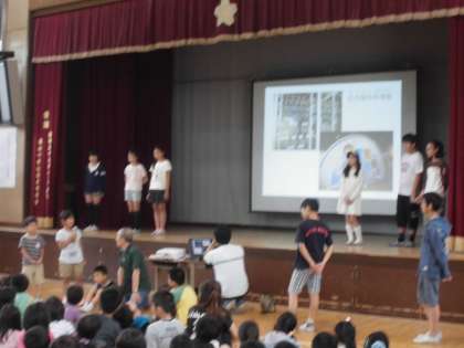嵐山タイムは今年度初めてです。6年生が5月に行った修学旅行で行った場所で,そこで感じた気持ちを発表してくれました。5年生以下はよい姿勢で聞き入っているようでした。発表後には,学年代表が6年生に質問をして,6年生も応え,双方向のやり取りができました。