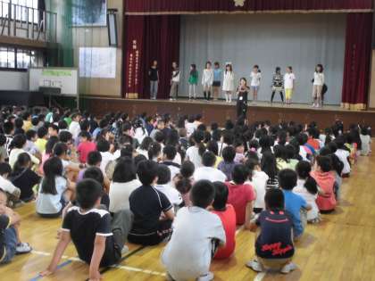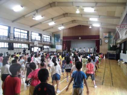 運動会まで1週間余り。中間休みを使って全校体操の練習を行いました。5日(木)は高学年とつくし学級,6日(金)は低学年と学年ごとに分かれて,係の子どもたちがステージでお手本を見せながら練習しました。