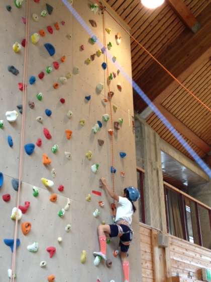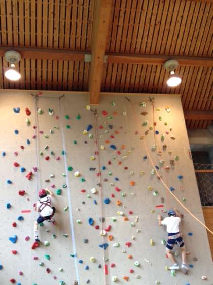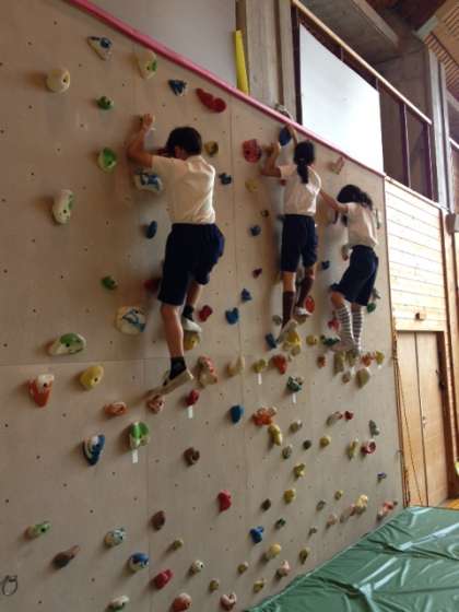 子どもたちも初期の練習を終え,ヘルメットと命綱を付けてのクライミングとなりました。結構高さがあるようです。