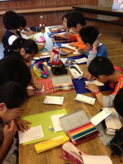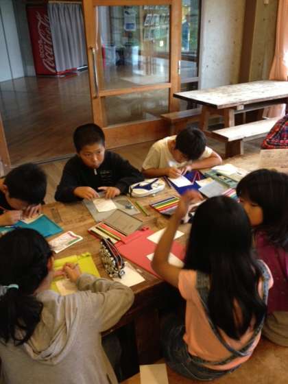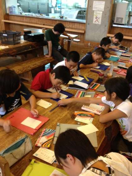 4日間の思い出をはがきにかきます。思い出いっぱいのはがきが後日,自分のおうちに届きます。