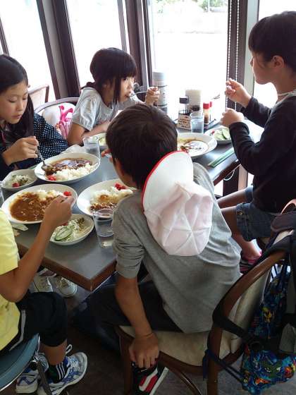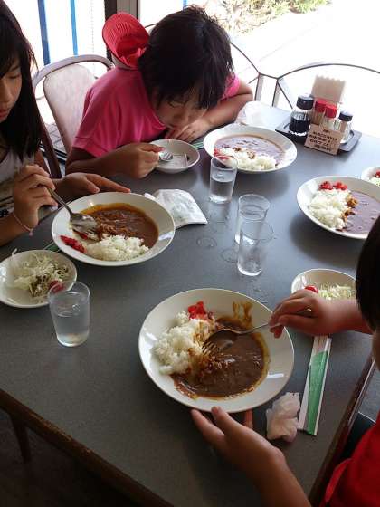 めずらしい海の生き物にくぎ付けになっていた子どもたちですが,お昼ごはんのカレーに今度は夢中です。