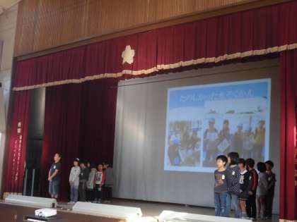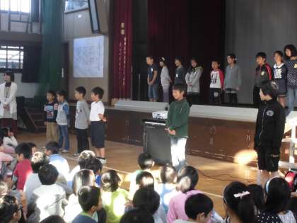 7日(金)に11月の朝会と2年生の嵐山タイムの発表がありました。朝会では,校長先生から寒くなってきた中で安全に登校するのはどうするのか,特に「気持ちよい挨拶の仕方」について,教職員の実演を交えながらお話がありました。2年生の嵐山タイムでは1年生とつくし学級と一緒に京都市水族館に行ったことをテーマにして,マイクなしで堂々と発表してくれました。発表後には,学年の代表の子どもたちから感想や質問をして,発表した子どもたちとのやり取りもしました。
