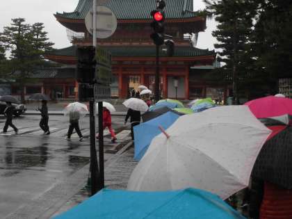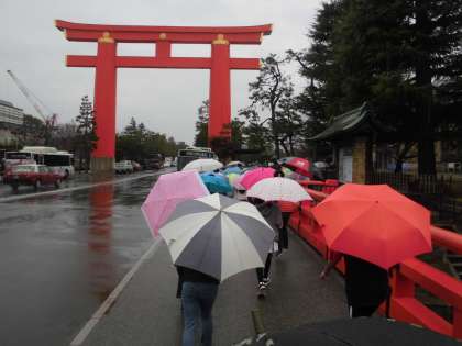 お弁当の後は散策へ。首をあげて見上げるほどの高さの大鳥居,京都市勧業館「みやこめっせ」,京都市美術館,京都府立図書館,京都国立近代美術館,平安神宮など,神社やお寺,文化施設が集まっている所をじっくり見て回ることができました。