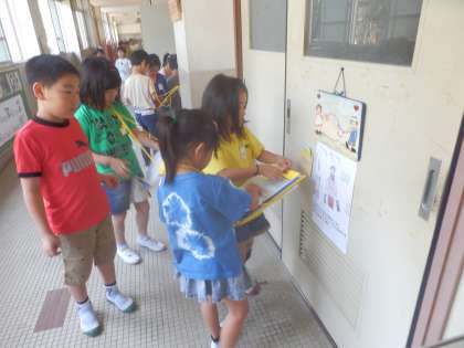 二年生が、一年生の手をつなぎながら、学校にある教室をまわりました。ルールを守りながら、教室の前に着くと、どんなことをする教室なのか、どんなものがおいてあるのかを説明していました。たんけんから帰ってきた子どもたちは、緊張がとけて、ほっとしたような顔をしていました。