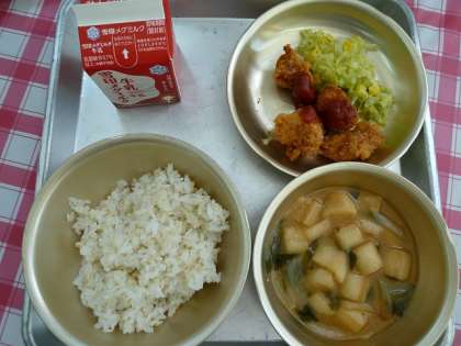 牛乳・麦ごはん・チキンカツ・ソテー・みそ汁です。