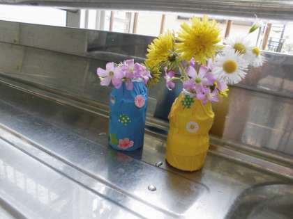 そこで,小さな入れ物のに折り紙を巻き,シールをはって花瓶を作りました。
