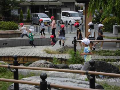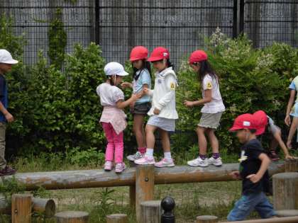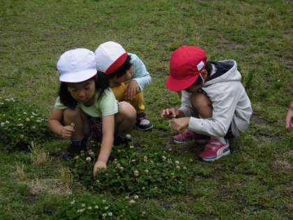 「ばったを見つけたよ。」「四葉のクローバーはあるかな。」「アリの巣があるよ。」など、自然と一緒に楽しく遊ぶことができました。