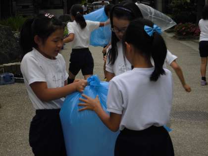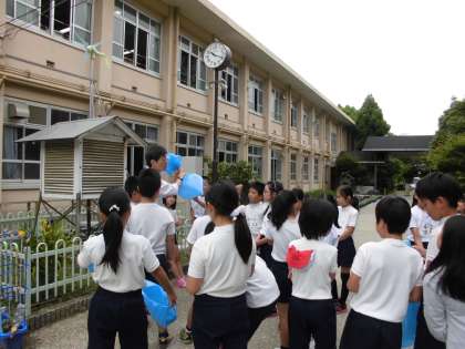 それぞれの班ごとに、袋いっぱいに空気をためて実験をしました。