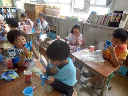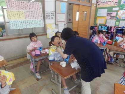 養護の先生に歯の磨き方や,6歳臼歯についての話を聞きました。大きな歯だけど,むしばになりやすく,しっかり歯を磨かないといけないことが分かりました。カラーテスターを使い,きちんと磨けているかどうか確かめました。6歳臼歯は「おうさまみがき」をするそうです。ぜひおうちでの歯磨き,がんばってくださいね!!