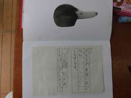 こくご「くちばし」の学習で,初めて「とい」と「こたえ」の文を学習しました。学習したことを生かして,今度は自分で好きな鳥を選んで,「くちばしクイズ」を作りました。「ヒントはどんな文にしようかな。」「早くクイズ大会をしたいな。」など,楽しみながら作りました。次の時間はクイズ大会です。