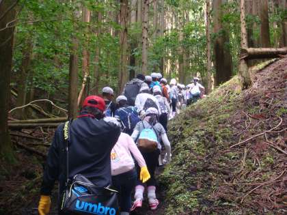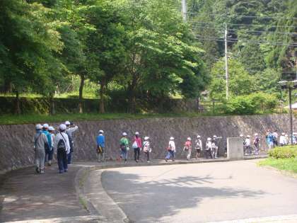 まずは,山ビル対策からはじめます。ズボンのすそを靴下の中に入れます。首には,タオルを巻いて,赤白帽子をしっかりかぶって,出発です。