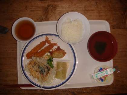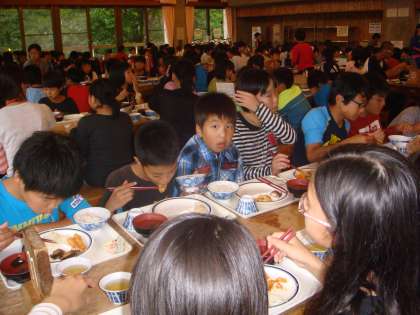 17:15から食堂で夕食です。本日も早い夕食ですが,子どもたちは,お腹をすかせていました。天狗杉登山で体力を使いましたもの。