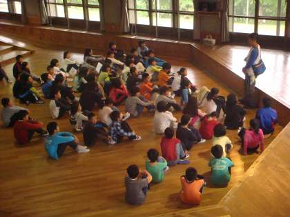 そのあと嵐山小学校だけで,さらに朝のつどいをしました。今日の活動の確認です。