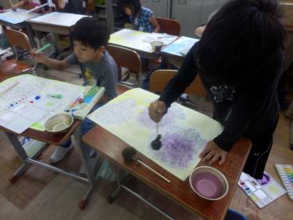 図画工作科の学習で,絵の具を使い,あじさいを描いています。今日は,タンポを使い,「ポンポンポン♪」と彩色していきました。外はどんよりとしたお天気でしたが,教室は鮮やかな色の絵でいっぱいになりました。どんな絵が完成するか楽しみです。