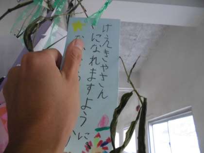 ,かざりとかざりをつなぐ学習をしたことをいかして,今回もつないでみました。また,短冊には,それぞれの願い事を書きました。「ともだちがいっぱいできますように。」「水の中にもぐれますように。」などなど,微笑ましいものばかりでした。願い事がとどきますように。