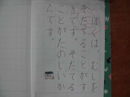 国語「すきなことなあに」の学習で,自分の好きなことと,そのわけを文に表し,友だちに知らせる学習をしました。入学してから3か月。文字だけでなく,文が書けるようになりました。お家でもノートを是非ごらん下さい。