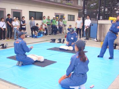 運動場では,心肺蘇生法とAEDの扱い方の訓練と消火訓練,消防士体験・防火衣着装体験をされていました。