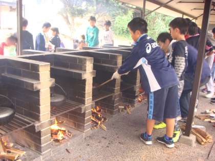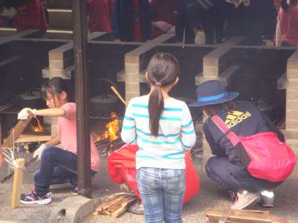火起こし係りさん,本当にご苦労様です。煙が目にしみてたいへんな状態でした。それでも,係りの仕事をまっとうしようとがんばってくれていました。