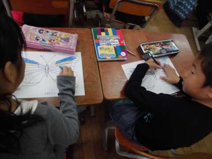 となりの友達と,色鉛筆のお店屋さんごっこをして,ちょうちょの色塗りをしました。