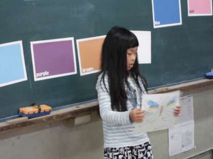 最後に,自分のちょうちょを紹介しました。覚えた英語を使って一生懸命伝えようとしている子ども達の姿がとても素敵でした。