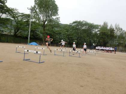 まずグループになって,ハードルをまたぎ越す時の足を練習したり,またぎやすい足は左右どちらなのかを決めたりしました。はじめは久しぶりのハードルに少し恐がっている様子の子もだんだん慣れてきている様子が見られました。その後自分に合ったインターバルを見つけて練習しました。