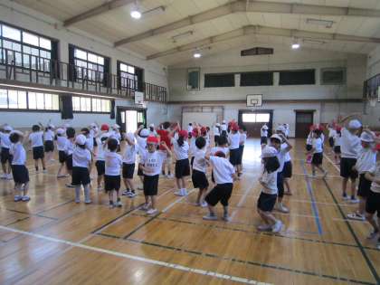 2年生は,運動会で沖縄の民謡である「ちゃーびらさい」を披露します。今日は初めて全体で曲を聴き,振りを練習しました。1,2,3,4,と拍を取りながら,みんな腕をピンと伸ばしてかっこよく踊れていました。