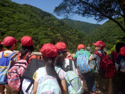 公園では,広場で遊んだり,展望台から景色を見たりしました。ちょうど,保津川下りの船も通っていて,みんなで手を振っていました。