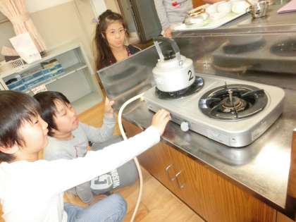 ガスの元栓を開けるところから,お茶を入れて片づけをすることろまで全て自分達ですることができました。火がついたら「おぉ!」と歓声が上がり,お茶を飲んでいる時は「自分でいれるお茶はおいしい」と言っていました。
