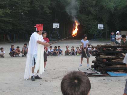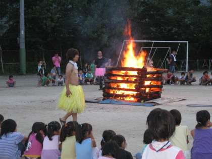 夕食にクッキングパル特製のカレーをいただき,18時30分からは,メインイベントのキャンプファイヤーです。火の神様の点火に始まり,歌のおにいさんやギターや太鼓のおじさんの登場などで大いに盛り上がりました。