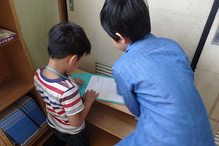 月曜日の3時間目,学校探検がありました。1年生と2年生がペアで学校中をまわります。スタンプラリーのように,学校の地図を片手にスタンプやシールを探して歩きました。