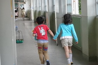 2年生は,事前に作ったポスターを使ったり,いろいろな説明をしながら案内してまわります。1年生は,どんな時に使う部屋なのか,誰がいる部屋なのかを一生懸命聞きながら,あちらこちらを行き来しました。はぐれないように手をつなぐチームや,楽しくおしゃべりのはずむチームもたくさん見られるなど,ペア同士仲良くなったようすでした。