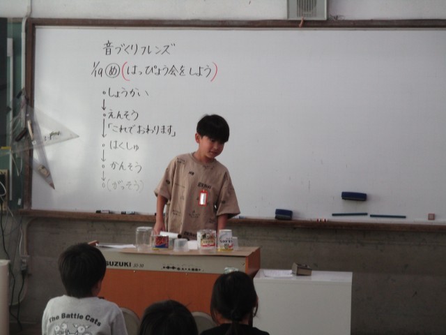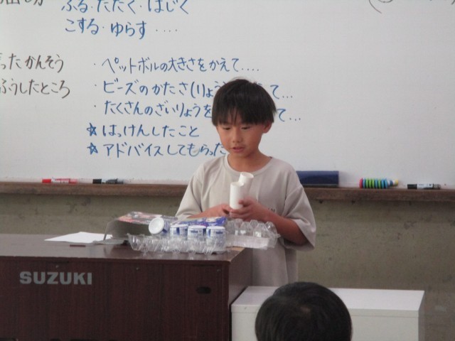 緊張している様子でしたが、友だちから「ビーズの大きさや量を変えると、音が違って面白かった。」「同じペットボトルでも振るのと揺らすのでは、音の大きさが違ってびっくりした。」と感想をもらうと、嬉しそうにしていました。