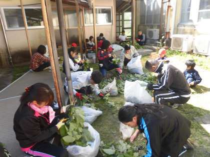 爽やかな五月晴れのもと,本校恒例の行事である「ふき採り」をしました。この行事は,宕陰の自然環境に関心を持つことや縦割り班による協働意識の醸成を目的としています。また,採れたふきは長さ毎に選別をし,地域の「フレンドパークまつばら」さんに買って頂きます。その収益を毎年義援金として送り,社会貢献の意識を養うことにもつながっています。