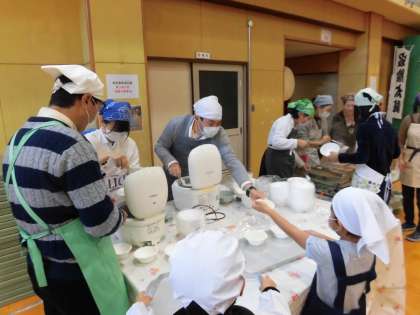 その後は,みんなが丹精込めて育てたお米を炊いて,地域の皆さんに振る舞いました。新米と大根焚きを召し上がっていただきました。